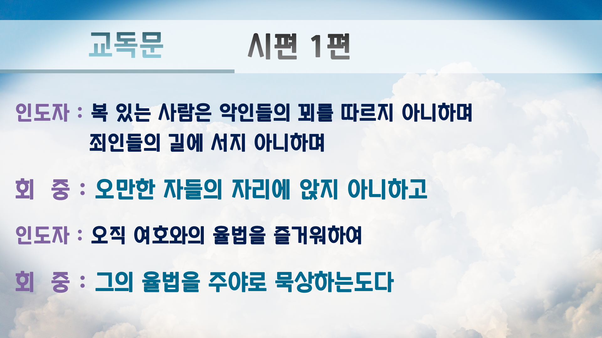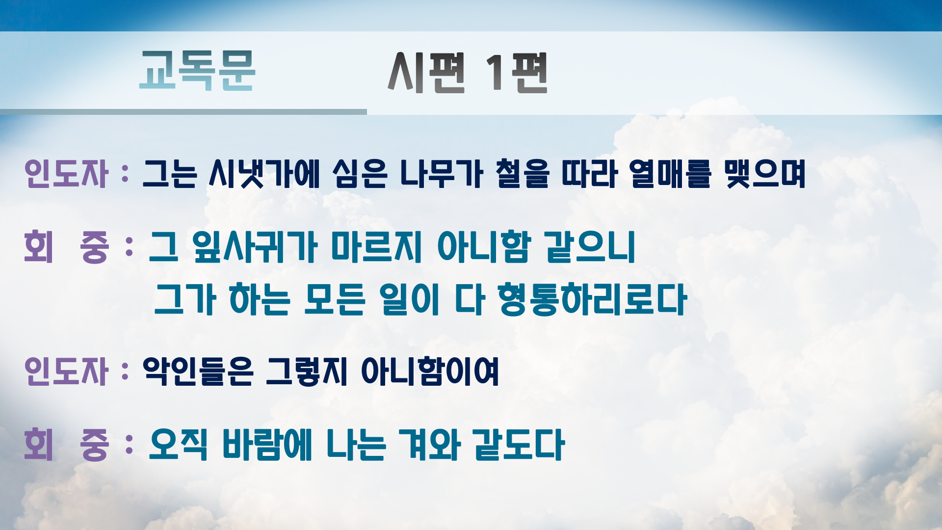 (다같이) 무릇 의인들의 길은 여호와께서 인정하시나 악인들의 길은 망하리로다 (1-6)
