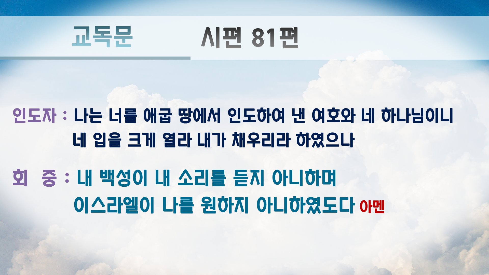 교독문에는 원래 '아멘'이 없지만 PPT만 보는 회중쪽에서 언제 끝나는지 몰라하셔서 끝나는 곳에 '아멘'을 추가 했습니다.