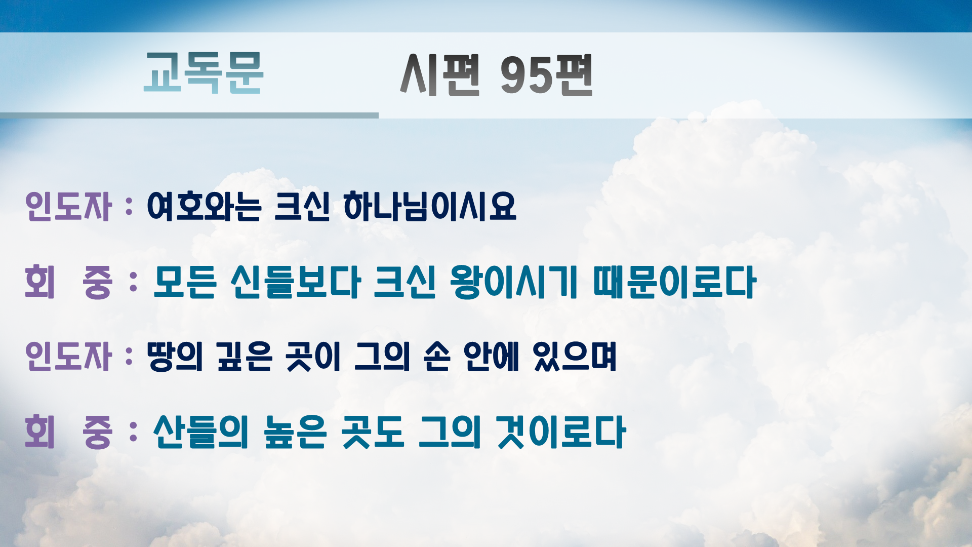 (다같이) 그는 우리의 하나님이시요 우리는 그가 기르시는 백성이며 그의 손이 돌보시는 양이기 때문이라(1-7상)