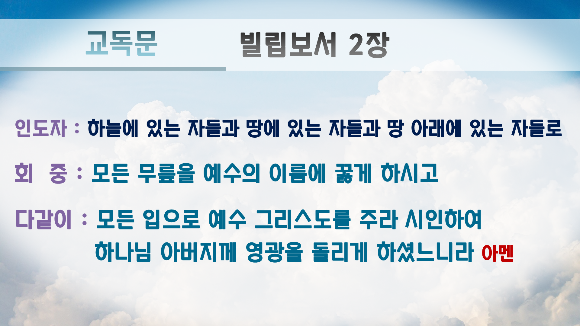 (다같이) 모든 입으로 예수 그리스도를 주라 시인하여 하나님 아버지께 영광을 돌리게 하셨느니라(5-11)