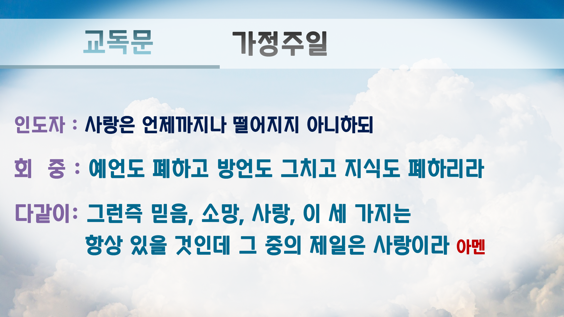 (다같이) 그런즉 믿음, 소망, 사랑, 이 세 가지는 항상 있을 것인데 그 중의 제일은 사랑이라(고전 13:13)